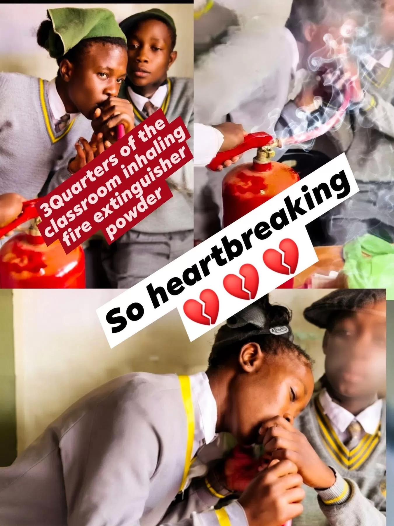 Johannesburg, South Africa – Concern has been raised after 30 students, including 10 girls, were rushed to hospital following an incident involving a fire extinguisher at a local school. According to reports circulating on social media and local community groups, the students were exposed to powder from a fire extinguisher, which led to breathing difficulties and other health concerns. It is ⚠️ warned by the department of Healthcare and education services to the parents who have some children circulating on social media platforms when they where taking videos inhaling a fire extinguisher powder,, it is no...