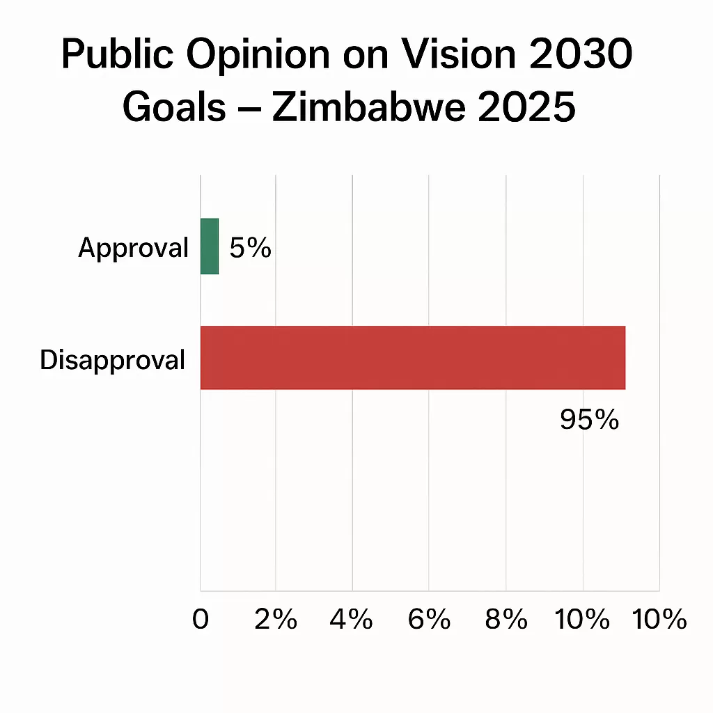 A new public opinion survey has sent shockwaves through Zimbabwe’s political landscape — revealing that 95% of Zimbabweans have lost confidence in President Emmerson Mnangagwa’s “Vision 2030” economic blueprint. The ambitious plan, launched to transform Zimbabwe into an upper-middle-income economy by 2030, is now being overwhelmingly rejected by citizens who say the promises of jobs, development, and stability have not materialized.