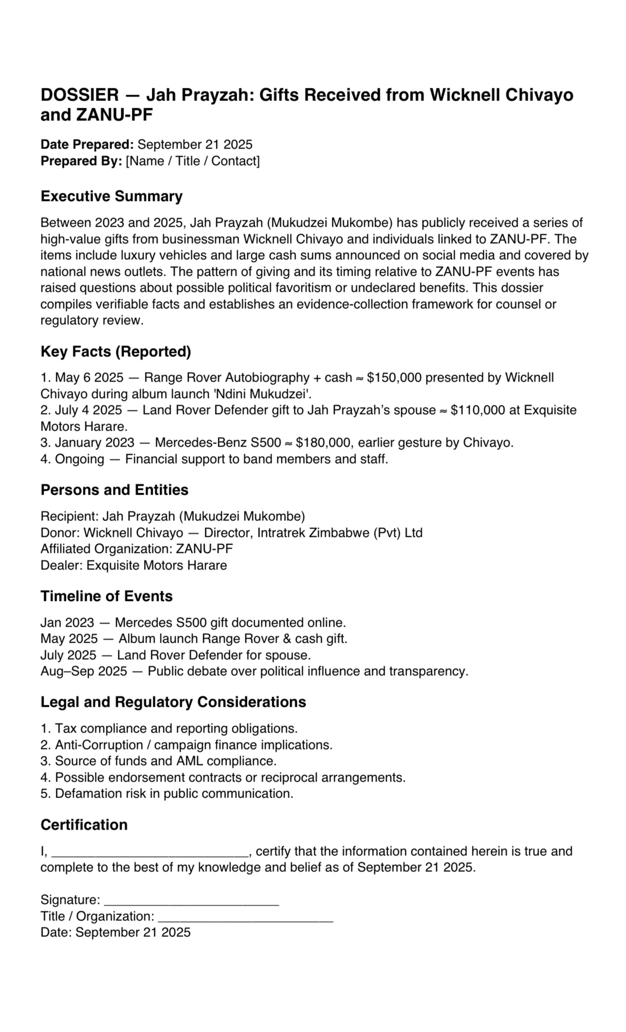 The 2025 dossier, formatted for legal and regulatory scrutiny, recommends further investigation into the tax, corruption, and campaign-finance implications of the transactions. It highlights the need for verification of vehicle invoices, bank records, and social-media evidence, calling on relevant authorities to assess whether the musician declared these gifts and whether Chivayo used personal or state-derived funds. While the document does not make criminal allegations, it underscores the growing concern over blurred lines between art, politics, and business in Zimbabwe’s entertainment industry.