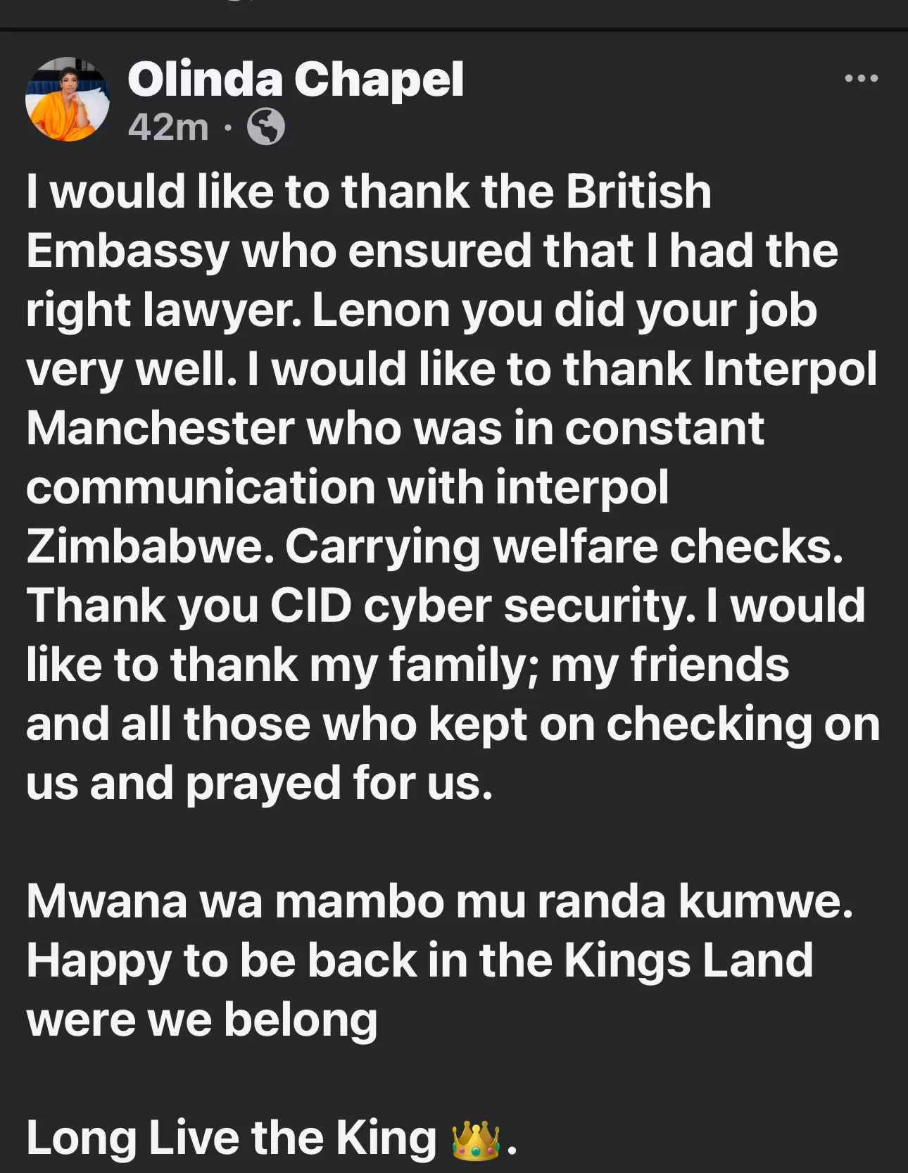 I would like to thank the British Embassy who ensured that I had the right lawyer. Lenon you did your job very well. I would like to thank Interpol Manchester who was in constant communication with interpol Zimbabwe. Carrying welfare checks. Thank you CID cyber security. I would like to thank my family; my friends and all those who kept on checking on us and prayed for us.