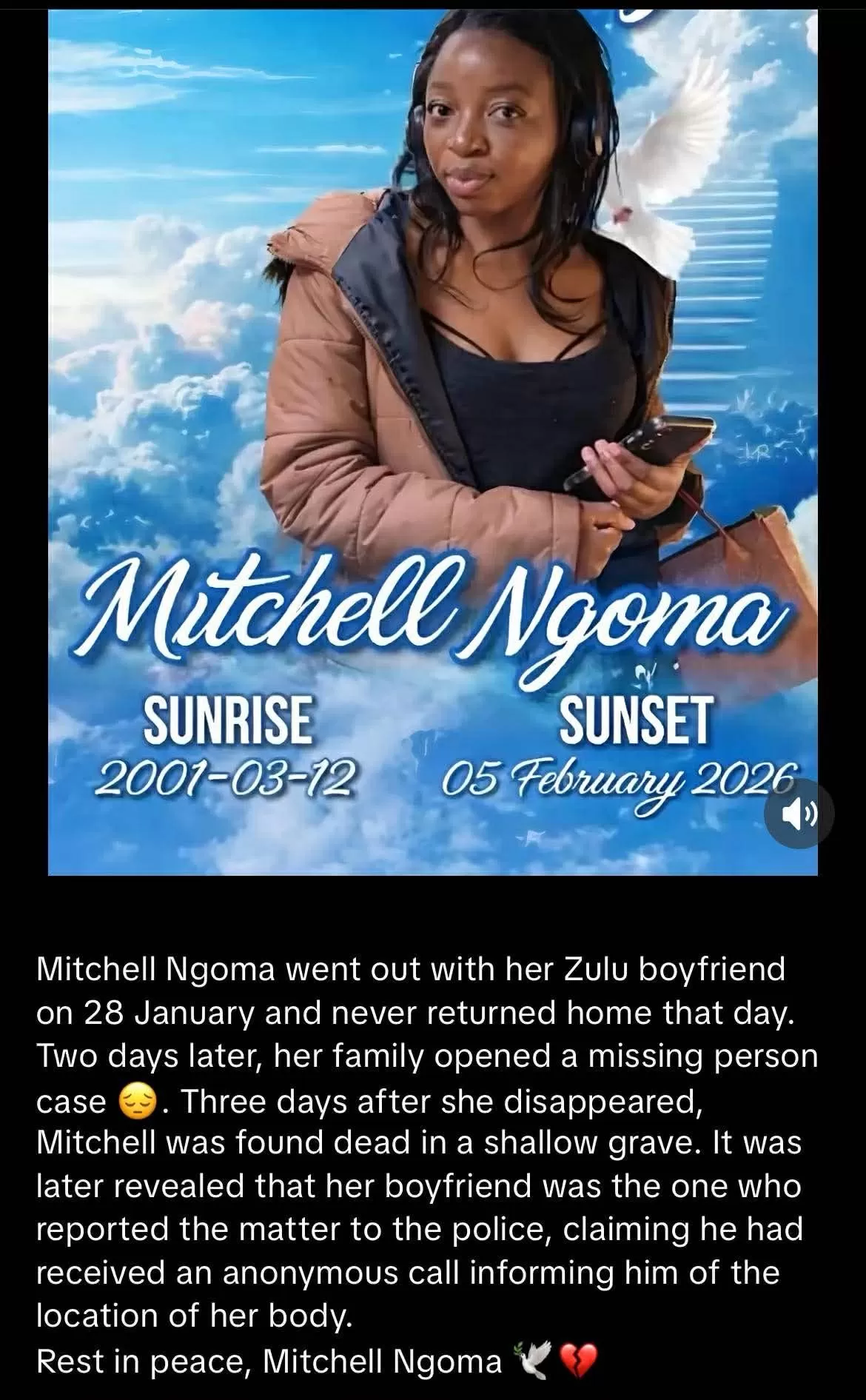 ? TRAGEDY OR ONLINE RUMOR? The Story of Mitchell Ngoma That Has Zimbabwe and South Africa Talking A heart-wrenching story about a young woman named Mitchell Ngoma has been widely shared across social platforms — and it has people demanding answers. According to social media posts circulating on X/TikTok/WhatsApp groups, Mitchell, born 12 March 2001, was reported missing on 28 January 2026 after going out with her boyfriend. Friends and family allegedly struggled to get information as days passed in silence. By 5 February 2026, those same posts claim Mitchell’s body was found in a shallow grave, and that her boyfriend ...